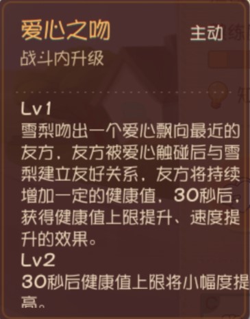 LV1:雪梨吻出一个爱心飘向最近的友方,友方被爱心触碰后会与雪梨建立链接,友方会持续增加健康值,链接30秒后可以提升友方健康值上限并提升速度。