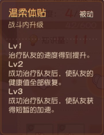 Lv3:增加效果成功治疗队友后使队友获得短暂加速。