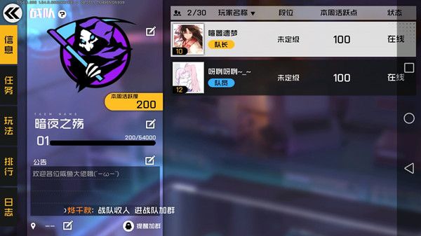 战队目前的人数和上线会显示在信息界面中成员界面的最上方,而提升其上限的最佳方式就是提升战队的等级。