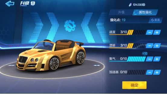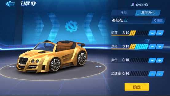 漂移是赛车的基础属性,在各高难弯道中,更是实现傲人战绩的关键。因此,漂移属性重点强化,也是黄金敞篷跑车强化的重点。车手可将8-10个强化点使用在漂移属性上,这样黄金敞篷跑车能够获得更优秀的漂移操控性,尤其在过M弯时,更有优势。