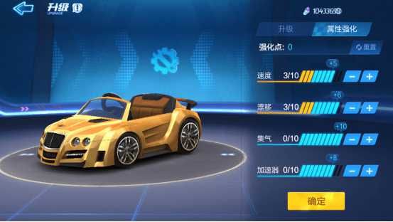 一定要先对它漂移和集气进行强化,弥补它竞速时集气方面的短板。当这两个属性强化完后再将强化点分配到加速道具上,大大提升车子加速性能,让这款车变得更加优秀。