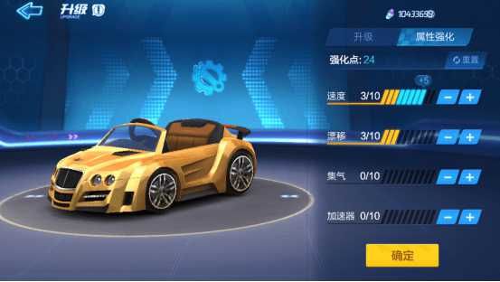 黄金敞篷跑车是平衡性极佳的赛车,在获得属性值后,可全面再次调整爱车的属性值,使得黄金敞篷跑车成为一款全赛道优秀车辆。车手还要注意对黄金敞篷跑车的弱势进行强化,例如,黄金敞篷跑车升级前最高速度在180km/h,升级后对速度进行强化,提升到最高车速200 km/h更合适,可轻松挤入一流赛车行列。车手可将8点以上属性点投入到速度属性提升上。