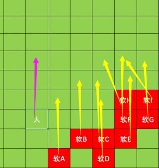 上面这种情况 如果人向左撤退 那么史莱姆的移动路线 大概会像我标注的那样 拉成一个横排 拉开了一些史莱姆和我们之间的距离 (其实因为人多 所以不会十分理想 但是具体意思差不多)