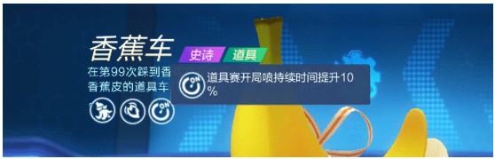 “香蕉车”在道具赛中可是一把好手,使用它不仅能把本就BUG的香蕉皮道具升级成巨型香蕉皮,还能在脱离水炸弹、水苍蝇后获得瞬间加速效果。还有增加10%的开局喷持续时间更是让驾驶它的司机从起点处就能一马当先!