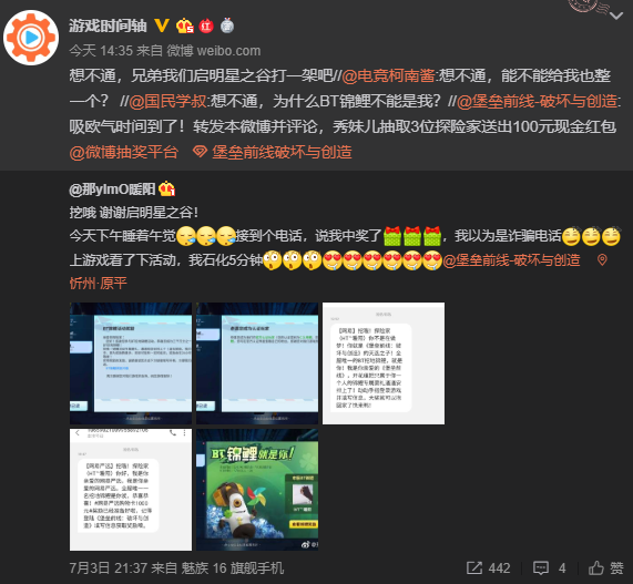 面对这份天降大喜,HT℡暖阳不由前往微博与好友分享了这份喜悦。从一开始默认将报喜电话视为诈骗电话,再到登录游戏石化5分钟,这位锦鲤的内心也如同过山车一般,经历了一番波折起伏。当然,也激起其他柠檬玩家的“想不通”:能不能给我也整一个?想要成为下一位锦鲤的探险家,不妨前往第一代BT锦鲤的微博吸吸欧气吧!