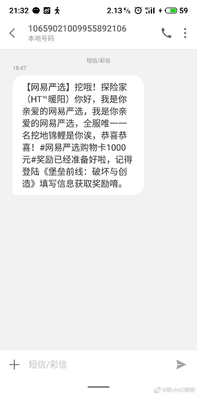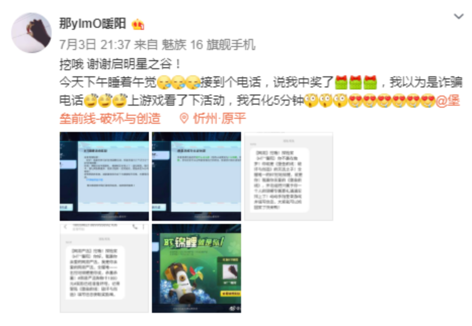 此外,网易严选、微博诸多游戏大V也通过短信、微博,特别为这位锦鲤送上专属贺词,让这位BT锦鲤喜上加喜!