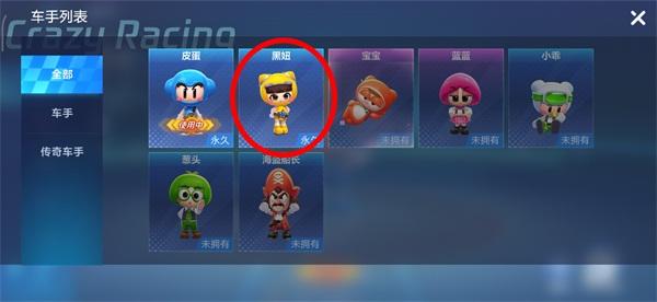 第三步:进入车手列表界面后,我们就可以看到全部的车手了,其中明亮的车手为已经解锁的,而黯淡的车手为没有解锁的,同时游戏初始会赠送皮蛋和黑妞,这里木子就用这两位车手进行更换选择了。