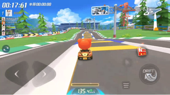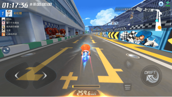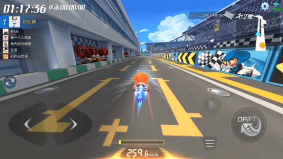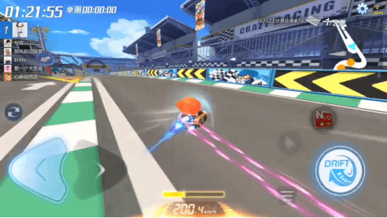 开局超级跑步后会面临一小段直道,这里奉劝各位跑跑er不要漂移,径直的通过前往第一个弯道即可。由于此地图中弯道的宽度和角度不同,属于比较难驾驭的一种,因此过多的小直道没必要浪费车速攒加速道具,过弯攒气方为上解。