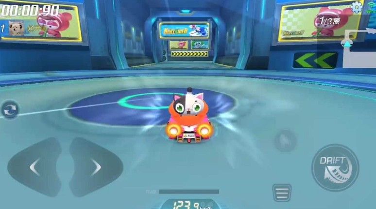 这个位置算是这个赛道的难点了,初次玩这个赛道对于这块路况不熟悉的话会很麻烦,但是大家只要跟着地图指引走就没有任何问题,这块的赛道路面非常宽阔,所以大家漂移时可以尽可能的补足氮气,不用害怕失误;唯一需要注意的是驶出平台后的直角弯赛道较窄,需要车手提前做出判断,并且在出弯后要赶快拉正车头。