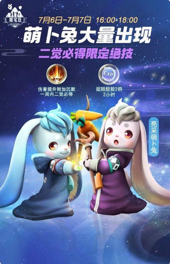 除此之外,御灵师在一周内将萌卜兔二觉,必得限定绝技。在拒宅日每日两小时活动时间内,御灵师捉妖更可获得双倍经验哦~