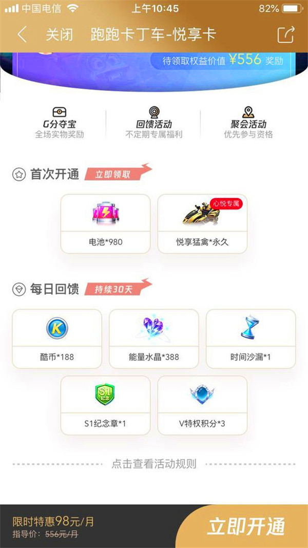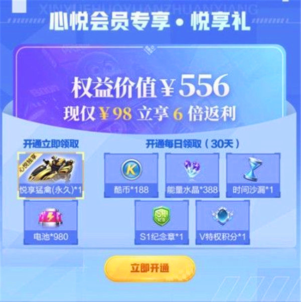 该礼包售价98元,在开通的时候可以回的心悦会员专属赛车悦享猛禽的永久期限和980个电池。而且开通之后的30天之内每天可以领取酷币*188、能量水晶*388、时间沙漏*1、S1纪念章*1、V特权积分*1的持续奖励。其实也就是相当于一张月卡了。