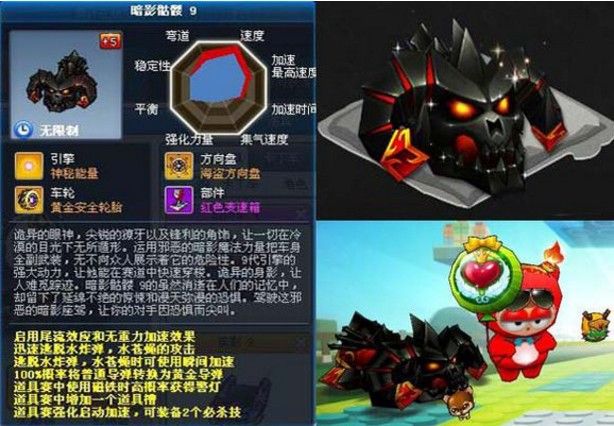 实战中没有防守的车经常被人一两个道具就打到后面去了,这种情况如果不赶快上位的话,落后是捡不到导弹和冰水的,那就只能跟在队伍后面捡磁铁和加速玩,好在暗影骷髅的磁铁能得警灯,除了增加上位能力,顺便还能转一下敌人。