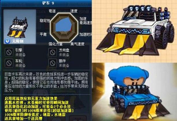 虽然看起来只比钢甲强一筹,但它面对盾车时,却是完美的天克,绝对速度上的优势,根本不用管你有多少盾牌,直接超车就行了,一个磁铁上去,一个超级加速拉开距离,完美套路,盾车一点办法没有。