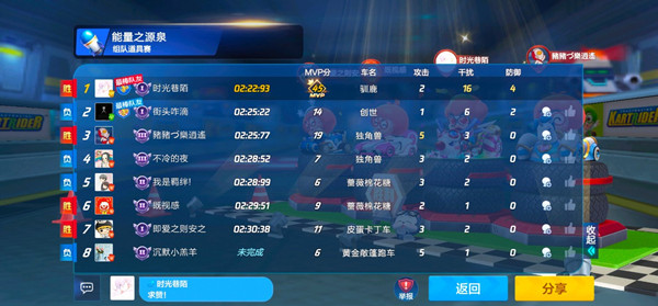 在多人组队道具赛之中每一场对局有会有一个MVP的诞生,注意要完成此次挑战必须要是8人场道具组队才行哦。而想要从全部参赛的八名车手之中脱颖而出取得MVP的荣誉,就需要玩家在结算之时取得当局最高的MVP分。