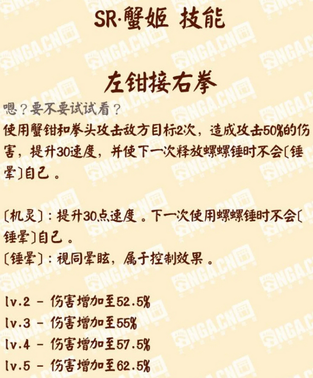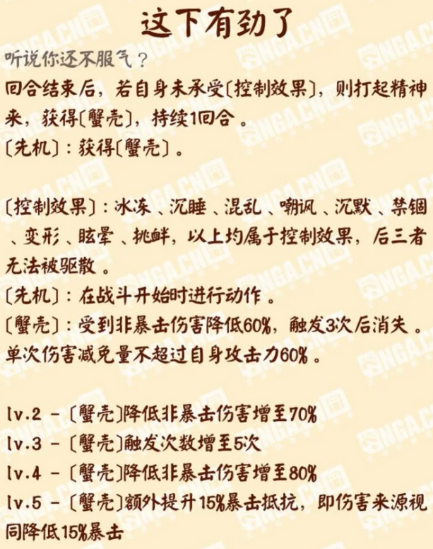 再看二技能————“这下有劲了”,充满中二气息的少女,充满中二气息的技能命名。二技能的重点在于“蟹壳”,效果为受到“非暴击伤害”降低,满级可以降低80%的伤害,抵挡5次,而且还能让攻击蟹姬的单位降低15%的暴击。再来看释放时机,首先开场“先机”释放,再者就是每回合结束之后未承受控制效果获得一次,持续一回合,同时在放大招把自己敲晕之后也会获得蟹壳。