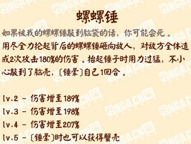 最后是三技能——“螺螺锤”,满技能两段每段207%的伤害系数可谓是很高了,所以制作组也特意加上了捶晕自己的效果,也就是放完技能后晕眩一回合,相当于自带返魂香,不过是给对面带的。但也有可以避免的方法,先普攻一下再放大招就不会捶晕自己。除此之外还有一个未经证实的办法,鬼灯速度卡在蟹姬后边,大招被晕,鬼灯解掉,疾风拉起来继续砸。
