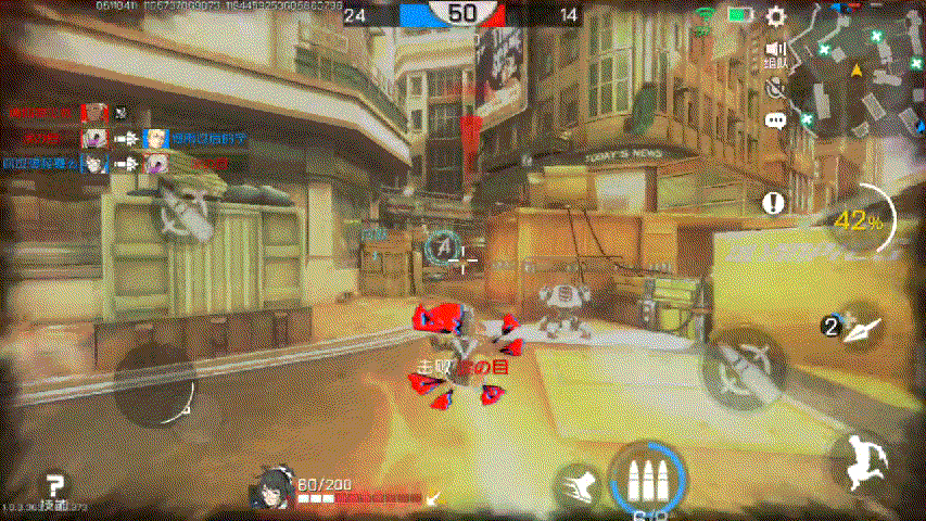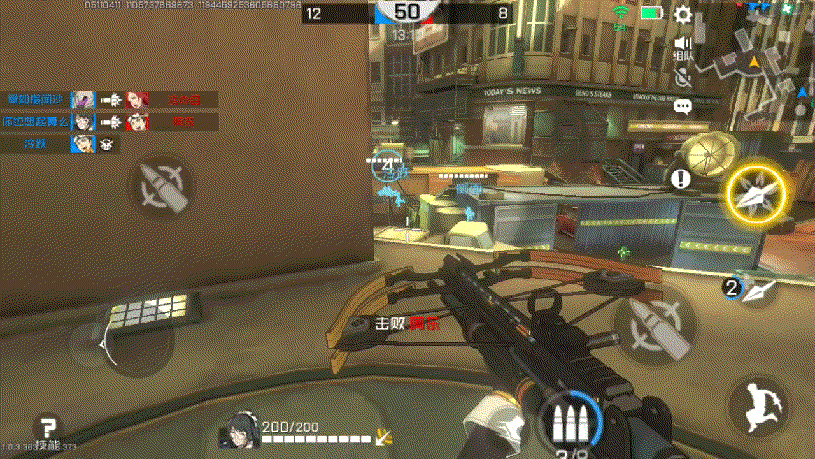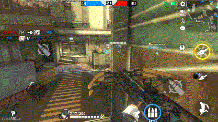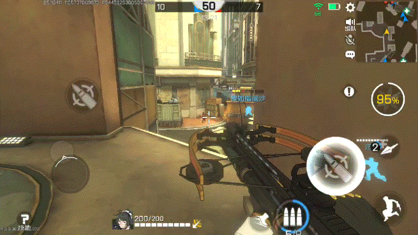 β小招—治疗箭:这个技能是"雪"的核心技能,不仅可以增加"雪"的生存时间还可以被对手"贴脸"的应对措施,如下GIF素材图上,狙击手一般被贴脸后没有留手大招很容易被一套带走,但是"雪"自带治疗技能很难被对手切入,而且治疗箭有着80点的对敌伤害,这个细节利用好了,近距离也再无敌手.