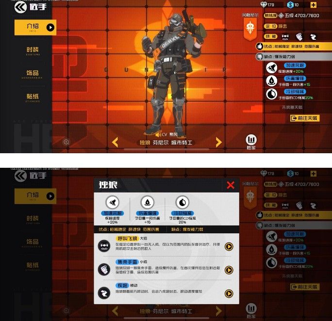独狼:独狼虽然说有被削弱,但是玩的好的独狼还是很强的,超快的移动速度,可以在战场上神出鬼没,小技能手雷,子雷贴脸爆炸75血,母雷全部踩中可以损失敌方120血(独狼的小技能手雷是会爆炸两次的,俗称子母雷),用好了独狼的小技能,会有意想不到的奇效哦,特别是在爆破模式里,如果对手残血下包或者安装炸弹,一颗手雷扔过去,嘿嘿,画面太美