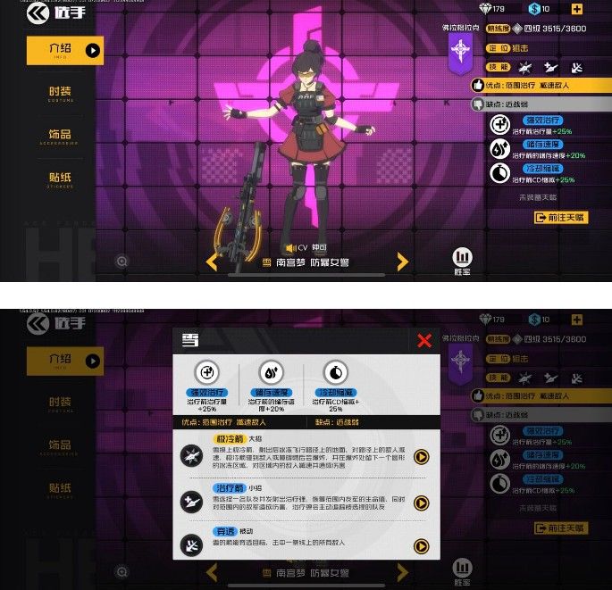 南宫雪:雪也是一名狙击手,不过雪比起其他狙击来说不同,她可以给自己加血,且一次性可以加101的血量,同时还可以对范围内的敌人造成等量的伤害,还可以给队友进行治疗,虽然没有指挥官那么好的视野,但是大大加强了雪在战场上的生存能力,想一想,如果刺客刚把雪给消耗大残,突然被一口治疗奶回来了大半,是何等的绝望????