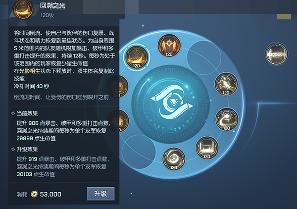 2、回溯之光:为自身周围8米范围内的队友随机附加暴击、破甲、多重打击提升10%的效果,持续12秒;