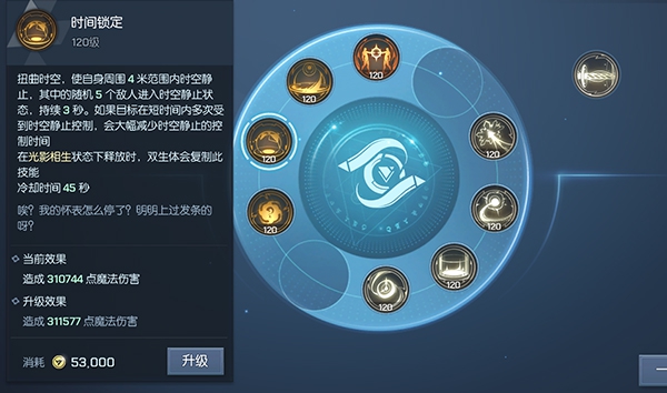 3、时间锁定:使自身周围4米范围内时空静止,其中的随机5个敌人进入时空静止状态,持续3秒;