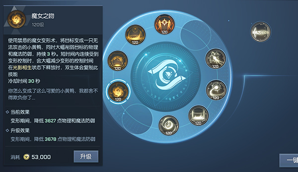 技能效果:持续期间冷却缩短等级提升4533,消耗金币进行升级;