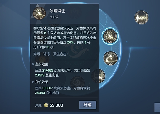 技能效果:初始级别效果是普通攻击与冰耀冲击提高215点魔法伤害,技能等级提升增加魔法伤害,消耗金币进行升级;