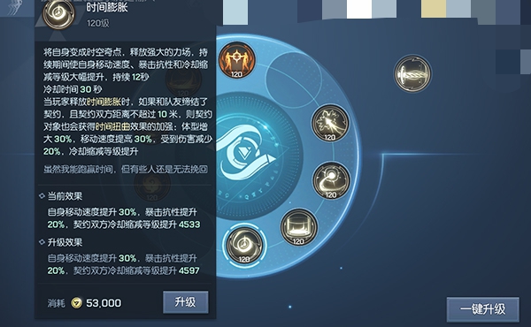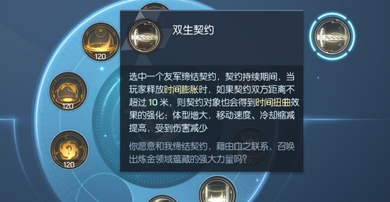 5、双生契约:选中一个友军缔结契约,契约持续期间,当玩家释放时间膨胀时,如果契约双方距离不超过8米,则契约对象也会获得一个时间扭曲的效果。契约持续600秒;