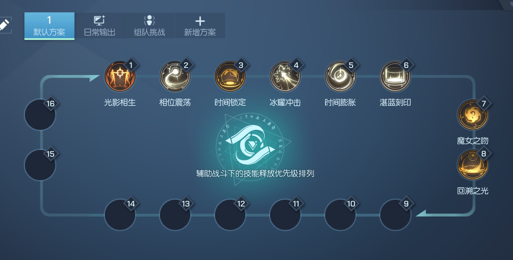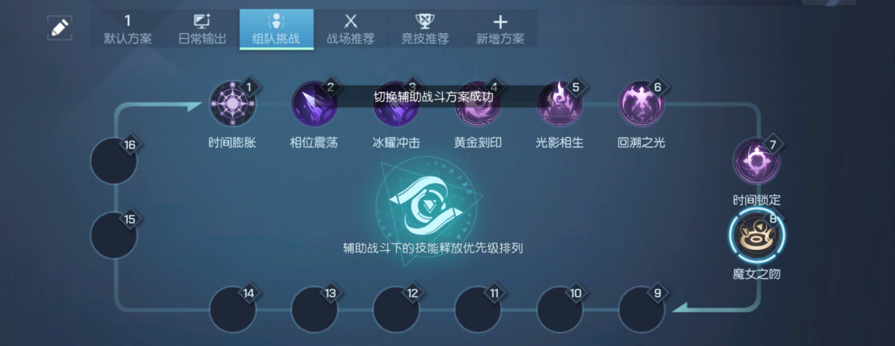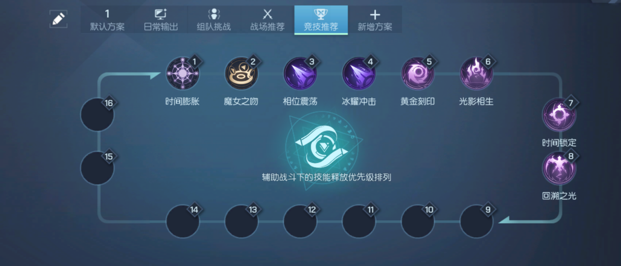 双生职业在PVP连招中可以先在技能界面编辑连招:时间膨胀、魔女之吻、相位震荡、冰耀冲级、湛蓝刻印、光影相生、时间锁定、回溯之光。