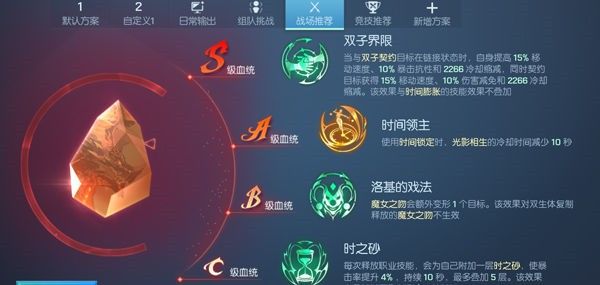 而适合双生职业的C级血统有:雪中芭蕾、时之砂、灵魂链接;B级血统有:天鹅共舞、时间法则、洛基的戏法;A级血统有:钟摆停滞、时间领主、密米尔之泉;S级血统有:冰川坠落、双子界限、圣餐。在PVP中推荐双生职业携带S级的冰川坠落、A级的密米尔之泉、B级时间法则、C级雪中芭蕾加强技能效果的持续时间以及攻击伤害;那么在PVE中推荐携带S级的冰川坠落、A级钟摆停滞、B级时间法则、C灵魂链接,这套配置主要是以辅助队友和增强自身攻击力为主。