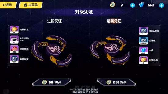 追求更高奖励的玩家可以选择消费600礼包币,将先锋凭证升级为进阶凭证,拥有进阶凭证的玩家在到达指定等级时可以获得更多的奖励;甚至可以通过消费1280礼包币直接购买精英凭证,在获取进阶凭证奖励的同时,额外获得限定头像框和大量历练值来快速提升自己的等级。