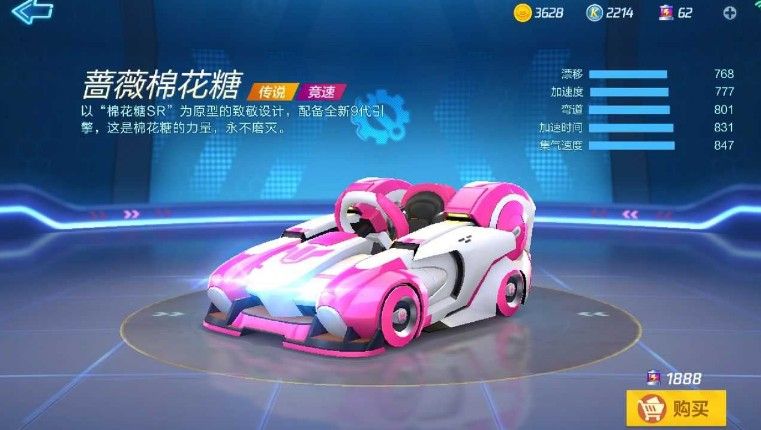 终于迎来了我们今天的主角蔷薇棉花糖,五大车系之一的棉花糖一直以来就以出色的漂移手感闻名。在手游中这款卡丁车作为传说级别的赛车,单从级别就碾压了前几款,属性方面更是跟前几款有着质的飞跃;卡丁车的手感方面非常的稳、准、狠,再复杂的路况也能轻易化解。这款车子从新手到老手可以说是通吃,非常值得拥有!