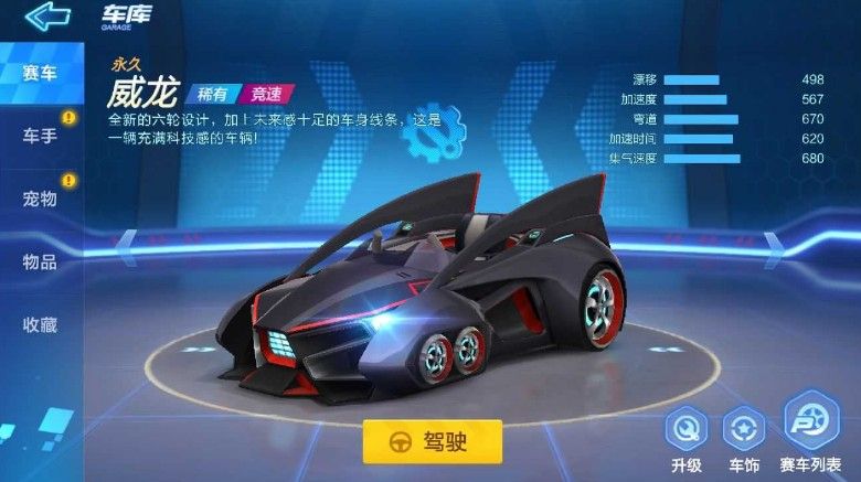威龙这款卡丁车只需要完成新手任务后便可以获取,属性较比踏板有了质的飞跃;手感方面也是不错,车子在弯道的表现比较良好,整体来说比较好操控,对于适应游戏操作比较适合;当然酷黑的外观也为威龙圈了不少粉。