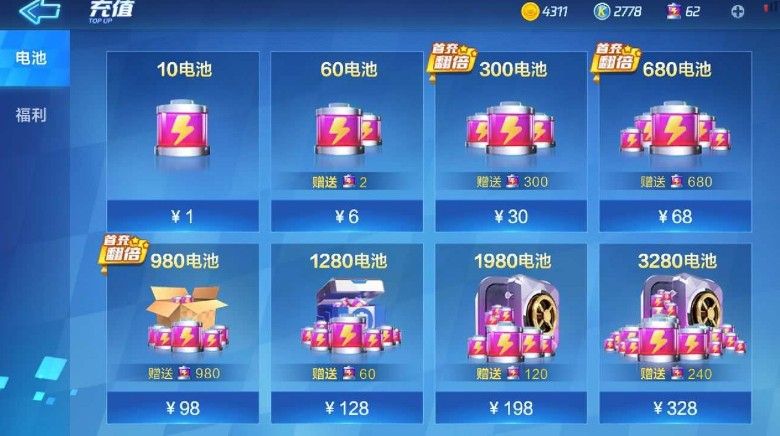 想要获取电池只有两个字“冲钱”,目前电池与R的比例为10:1,也就是1R可以得到10电池,但是商城充值中的活动非常划算只要充值指定量电池即可获得赠送。目前最超值的还是首充98R可以获得双倍电池奖励,在充值之后还可以开通月卡,每日领取酷币和电池真的是非常划算。