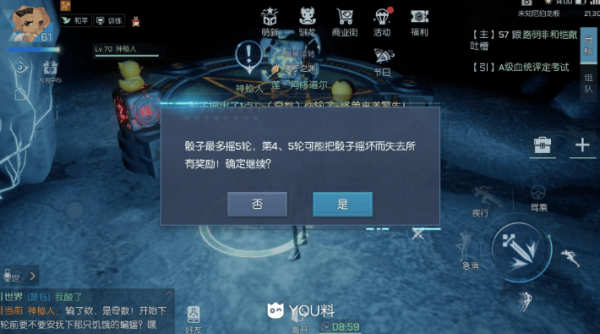 第五种赌场有点意思,先点轮盘中间的柱子,出现NPC后对话掷骰子,掷奇数输,掷偶数赢,骰子第四第五次概率爆炸,爆炸后没收全部奖品。这里推荐第一次掷5次,爆炸了会获得称号“幸运e”,没爆炸下次进入接着掷5次,直到获得称号。掷得时候留意一下如果前三次全是偶数,就一直掷下去,5次全偶数会获得称号“幸运a”。获得了称号后,再根据自己运气选择掷不掷第四第五次。