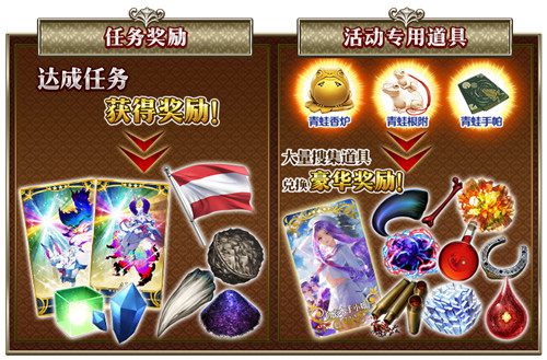 在挑战主线的同时,达成「收集一定数量以上的特定道具」、「打败特定的敌人」等各种条件,即可触发包含豪华奖励的任务!此外,随着任务的不断达成,还会有新的关卡和任务开放。完成任务还能通过使用活动素材「青蛙香炉」、「青蛙根附」、「青蛙手帕」兑换获得活动限定概念礼装「白衣水手小姐」和其他素材!