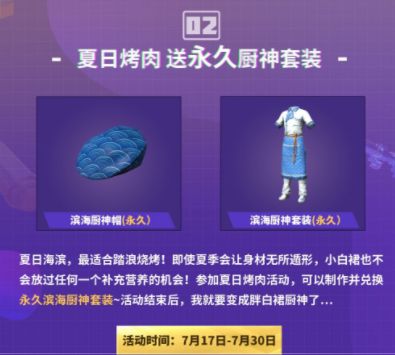 滨海厨神的获取方式就是依靠活动物品来兑换的,在游戏主界面大厅的右下角活动下方将折叠打开就可以看到三个目前正在进行的互动活动,分别是特工巴纳纳套、烤肉大师、领永久动作,也可以直接点击活动按钮在里面找到“烤肉大师”活动,滨海厨神就是这个活动兑换来的。