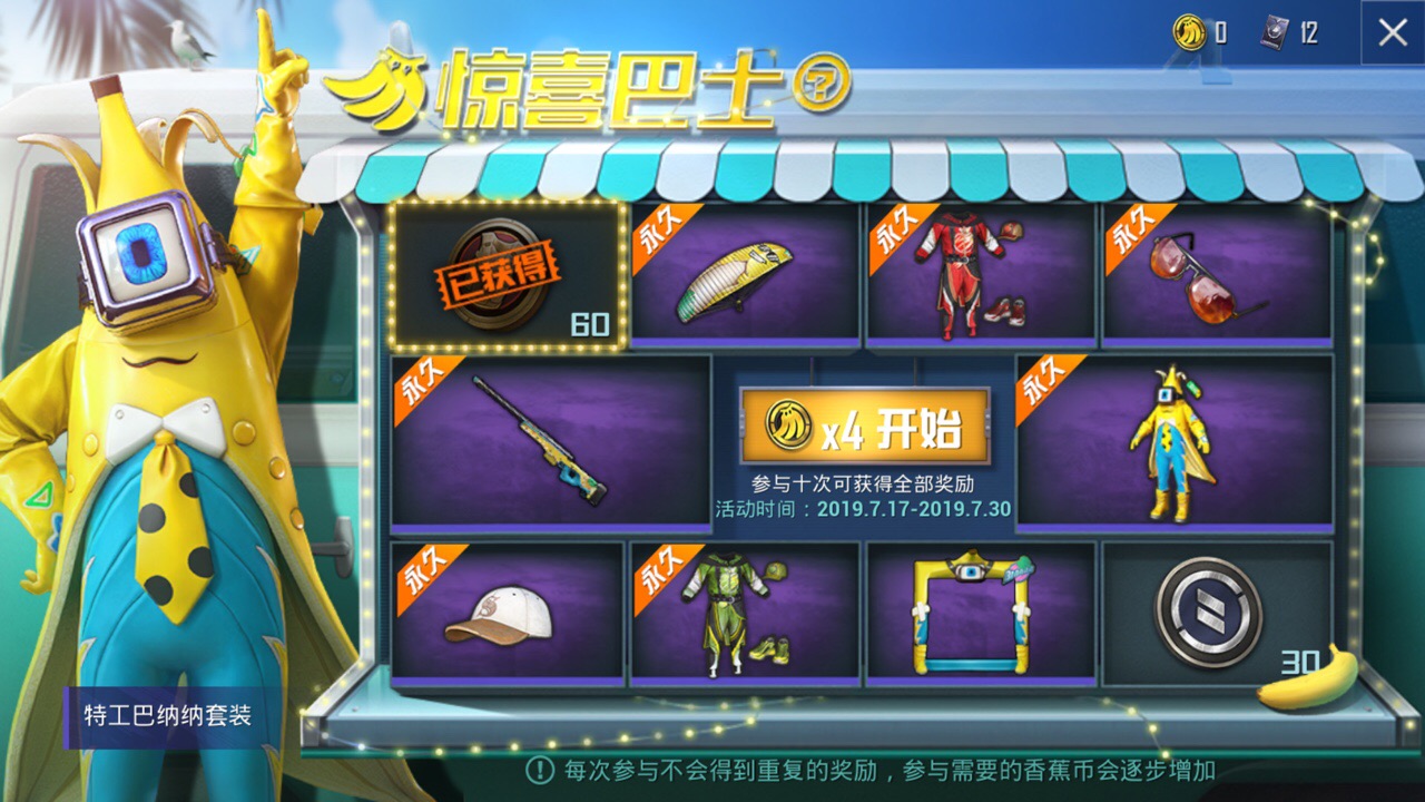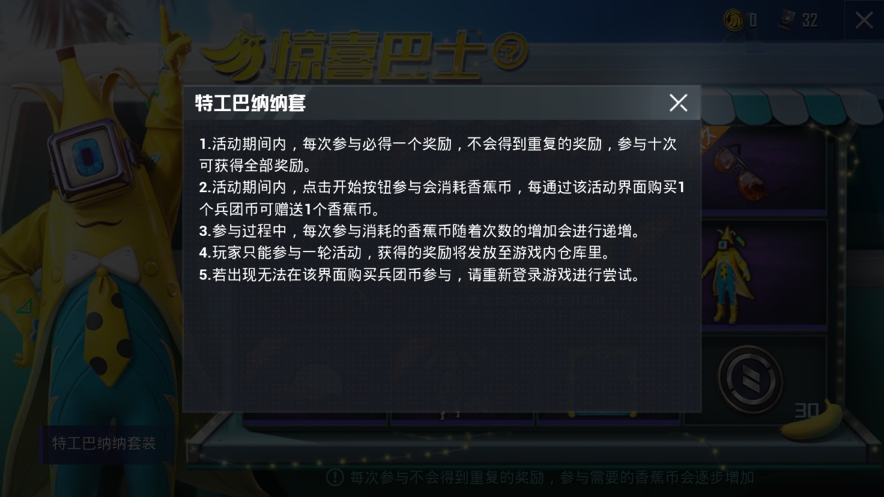 2.活动期间内,点击开始按钮参与会消耗香蕉币,每通过该活动界面购买1个兵团币可赠送1个香蕉币。