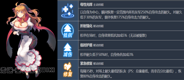 四能级是这个机师唯一的奶技能,奶量有点锉刀,技能还有15s的cd,但是看在是被动可以自动释放并且是全体回复的情面上自律还是很好用的。