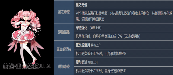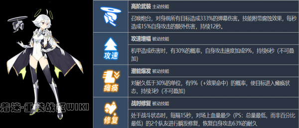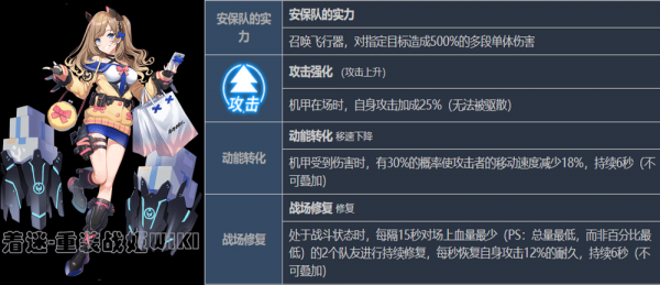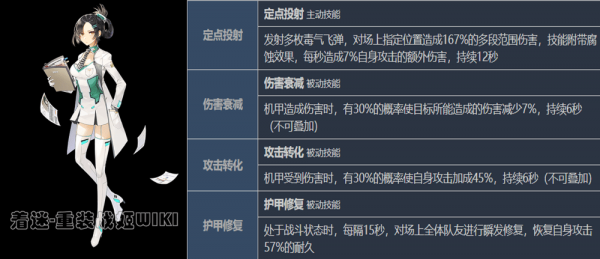 妮泽的主动技能同样不是回复技能,而让她成为奶的技能是四技能。妮泽同样算是个半奶半输出的机师