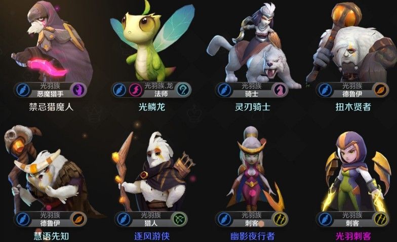 在拥有慧语先知(先知)、扭木贤者(大树)两张牌后,再补足幽影夜行者(幻刺)、光羽刺客(圣堂)两个光羽,便能触发光羽被动,使其有一定概率躲避敌人伤害。