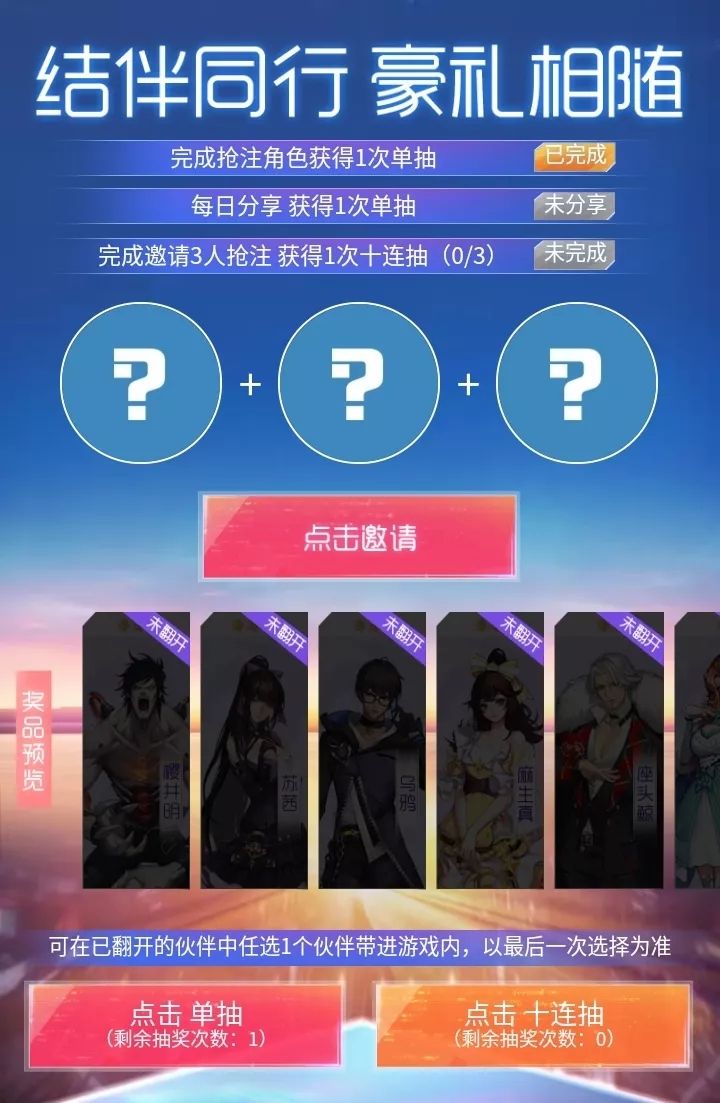 2. 活动期间内,每日分享活动,可获得一次单抽;成功邀请3位好友预创角色抢注,可获得一次十连抽翻牌机会;