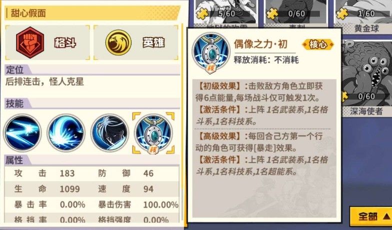 能量点的获取上和杰诺斯一样,都是每回合两点,可以用微笑超人的技能自带回血,也可以用卡片的装备效果回血,都可以。高级效果能召唤小弟作为前排保护后排,使后排可以放心输出,在对方没有有效的打击后排的方式的情况下,可能被自己的后排群体伤害打个团灭。评价是属于比较好用的核心技,在某些pve场合有不错的表现,比如是说打一些单体前排技能的boss。