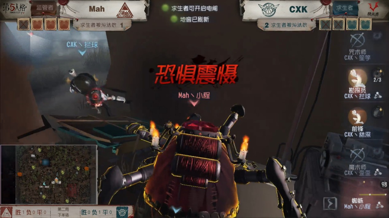 本周的高光监管者为Mah丶小程在对阵CXK战队的第二局下半场扮演的蜘蛛。在比赛中,虽然蜘蛛开局率先遇到了最不好对付的前锋,但是Mah丶小程在连续织网加速命中一次后果断选择转点并且成功找到勘探员击倒挂椅。面对直接赶来救援的前锋,蜘蛛毫不手软在触发了勘探员搏命挣扎后,紧接着回身击倒半血前锋并再度将勘探员挂椅。此时求生者方还需破译两台密码机,面对形势极为不利的情况,求生者方的咒术师和魔术师亦放弃破译密码机参与到救援。经过一番紧张激烈的博弈后,蜘蛛率先击倒魔术师,而咒术师面对气势如虹的监管者竟然没能及时引爆咒像守护反而被激活了兴奋特质的“金身”蜘蛛两度击倒挂椅。面对三名求生者失去行动力的情况,最后剩下的勘探员独木难支,虽然一度接近地窖点,但最后还是被监管者蜘蛛一波织网加速在板区打出一个恐惧震慑,顺利将四名求生者全部淘汰出局。至此,Mah战队凭借着这场关键的胜利以2-0的总比分击败CXK战队,顺利以小组第二的成绩晋级淘汰赛,期待他们在后续的比赛中可以打出更加精彩的表现。