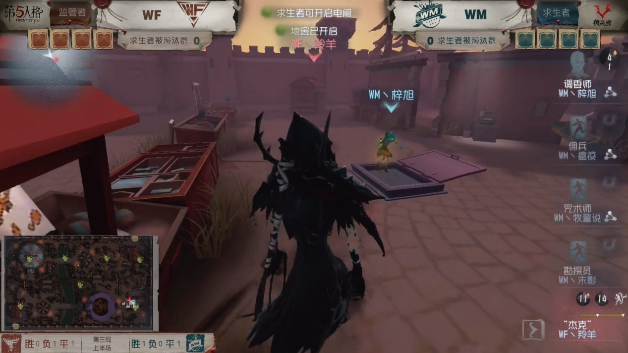 在本周第三个比赛日WF战队对阵WM战队第三局上半场的比赛中,由WM丶牧童扮演的咒术师、WM丶末影扮演的勘探员、WM丶梓旭扮演的调香师以及WM丶瘟疫扮演的佣兵组成的求生者阵容发挥出色。