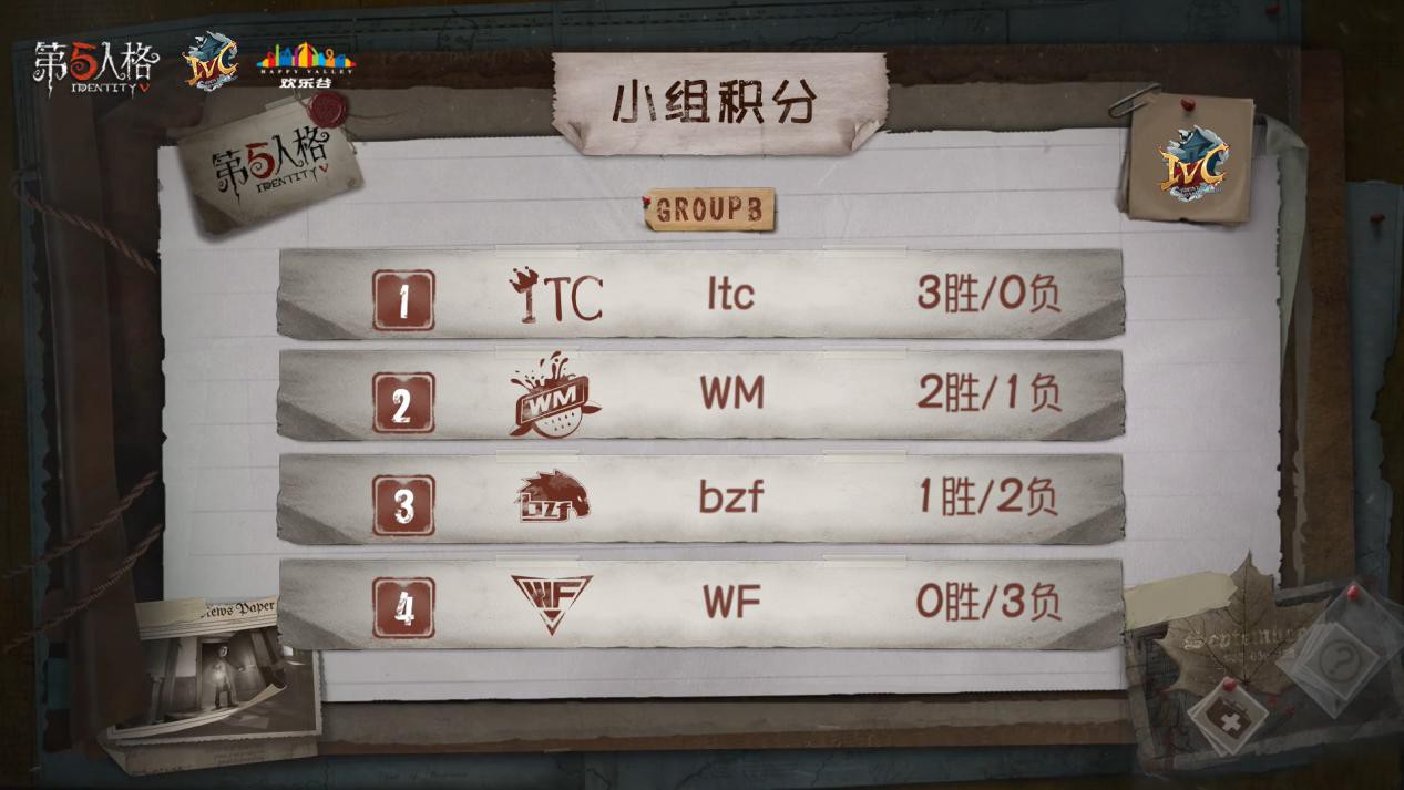 B组方面争夺激烈,在本周第一个比赛日的对决中,Itc战队连下两局战胜WM战队率先拿到两胜确保晋级资格。WM战队虽然首日不敌Itc战队,但是在第一周面对bzf战队时凭借精彩发挥获得胜利,又在本周第三个比赛日与WF战队的较量中鏖战三局力克对手,顺利以两胜一负的战绩晋级淘汰赛。值得一提的是,在本周最后一场比赛中,bzf战队面对实力强劲的小组头名战队Itc发挥出色,连续5回合的平局也让Itc战队吃尽了苦头,虽然在最后一回合较量中bzf丶颜粉扮演的监管者小丑没能淘汰两人以上从而导致bzf战队遗憾出局,但两支战队精彩绝伦的对决还是让观赛的玩家印象深刻,也为A组和B组的小组赛画上了圆满的句号。
