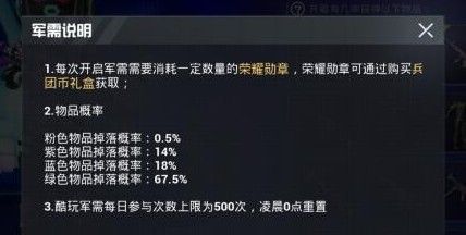 目前军需的价格是1次8元,10次72元,相比之前的是1次6元,10次54元,价格上贵了不少,但是质量很高。还有一点需要注意,这次军需新增了粉色品质,而快乐主宰人物皮肤和降落伞都是粉色品质的,粉色品质的开出率更低。以下是这个军需的所有品质开箱率,大家可以参考一下。