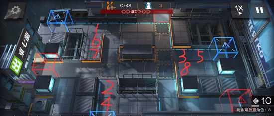 注:这一关只要合理布局干员,就还是比较简单的。近卫角色由于比较脆,都被安排在后排,输出会比较慢;如果奶量充足也可前置速刷。