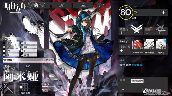 以干员阿米娅为例,图中阿米娅与博士的信赖值提高后,生命与攻击力都有一定程度的上涨。每位干员的信赖值达到100%时,额外属性便可以得到完全解放,而这些属性的加成往往可以帮助博士,让战斗变得更加顺利。