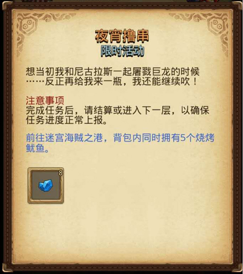 任务内容:前往迷宫“海贼之港”,背包内同时拥有5个烧烤鱿鱼。